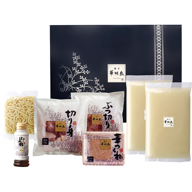 ■規格内容:水たきスープ600g×2、華味鳥切り身300g、華味鳥ぶつ切り300g、華つくね200g、博多ぽん酢220ml、ちゃんぽん麺150g