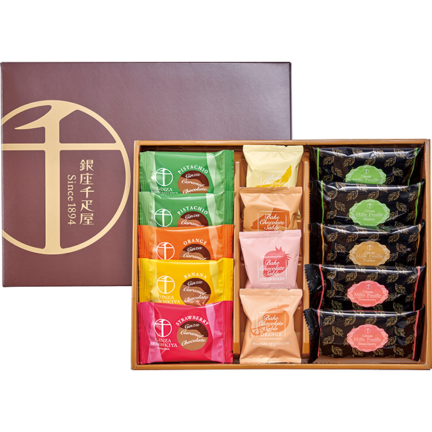 ■規格内容:銀座ミルフィーユ(メロン・ストロベリー×各2、プラリネ×1)、銀座焼きショコラサブレ(オレンジ・ストロベリー・バナナ・キャラメル)×各1、銀座キャラメルショコラ(ストロベリー・バナナ・オレンジ×各1、ピスタチオ×2) ※沖縄・離島は配送不可です