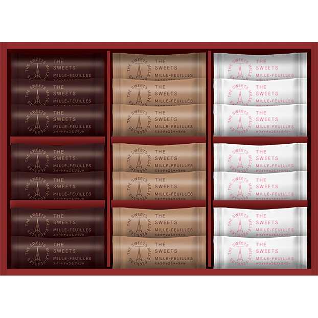 ■規格内容:ミルフィーユ×21(ミルクチョコ&キャラメル・ホワイトチョコ&ストロベリー・スイートチョコ&プラリネ×各7)