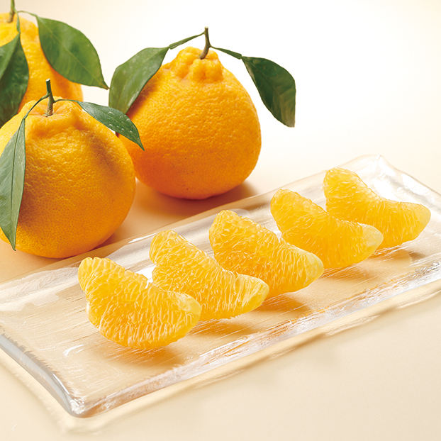 皮が薄いのでむきやすく、ほどよい甘さとすっきりとした酸味が特長、ポンと出たおでこがとっても可愛らしいフルーツです。