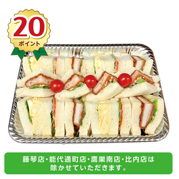 エビカツ、とんかつ、ハム、トマト、タマゴなど4種類のミニサンドがセットになった3~4人前のパーティーサンド