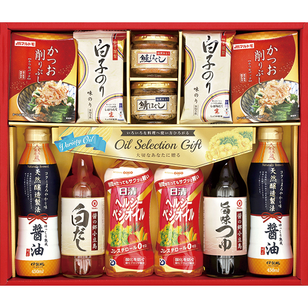 ■規格内容:マルキン(旨味つゆ・白だし)各360ml、日清ヘルシーベジオイル350g×2、伊賀越天然醸造醤油450ml×2、白子味のり(8切5枚)×4、マルトモかつお削りぶし1.5g×4P×2、鮭ほぐし40g、鯖ほぐし40g