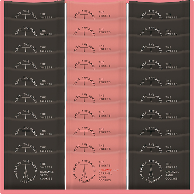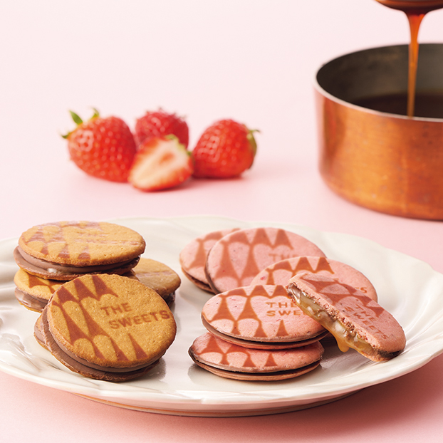 苺のフリーズドライを混ぜた濃厚なラングドシャ生地でキャラメルとチョコレートをサンドした苺キャラメルサンドとオリジナルフレーバーをセットしました。