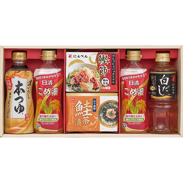 ■規格内容:日清こめ油350g×2、キッコーマン濃いだし本つゆ500ml、にんべん(鰹節(1.5g×3袋)・白だし500ml)、白子のり鮭茶漬3.8g×3