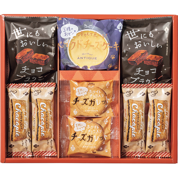 ■規格内容:サクサクチョコパイ×4、ホワイトチョコ入りチーズガレット・世にもおいしいチョコブラウニー×各2、冷やして食べる!ベイクドチーズケーキ×1