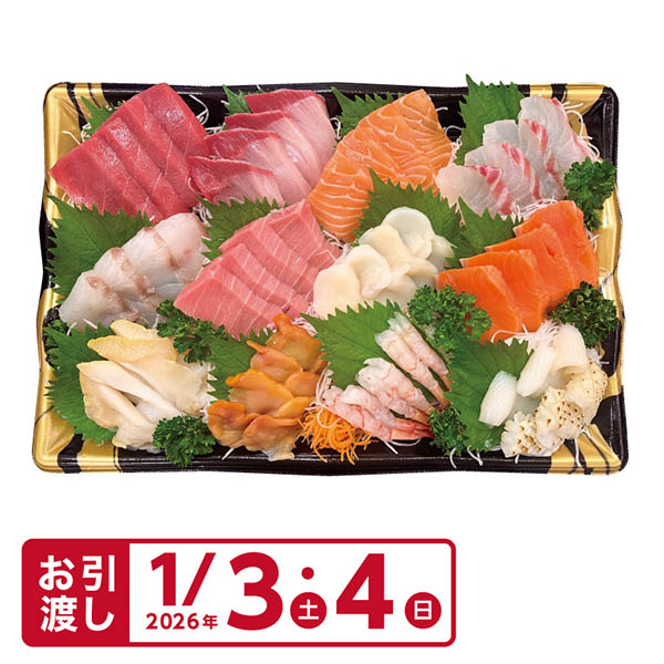 【養殖本まぐろ(解凍)、ぶり(養殖)、アトランティックサーモン(養殖)、真鯛(養殖)、平目(解凍)、養殖本まぐろ中トロ(解凍)、ホタテ貝(解凍)、銀鮭(養殖・解凍)、ツブ貝(解凍)、赤貝(解凍)、甘えび(解凍)、炙りムラサキいか(解凍)】