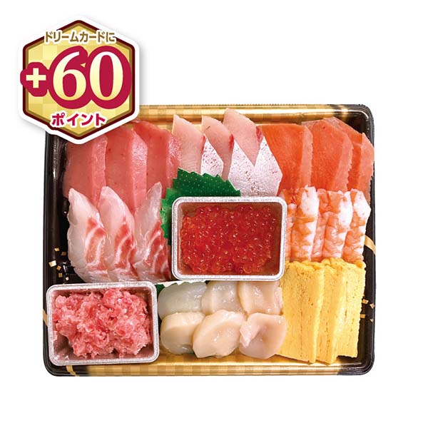 【メバチまぐろ(解凍)、養殖ぶり、養殖銀鮭(解凍)、養殖真鯛、いくら醤油漬け、寿司えび、まぐろたたき、ほたて貝柱(解凍)、玉子焼き】