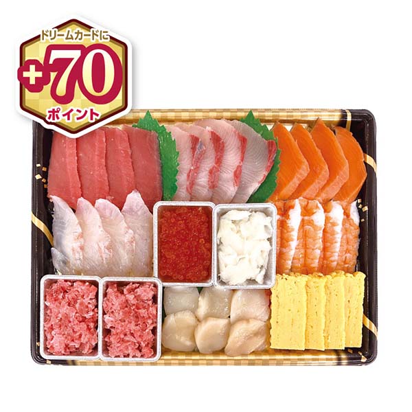 【メバチまぐろ(解凍)、養殖ぶり、養殖銀鮭(解凍)、養殖真鯛、いくら醤油漬け、カラスがれいエンガワ(解凍)、寿司えび、まぐろたたき、ほたて貝柱(解凍)、玉子焼き】