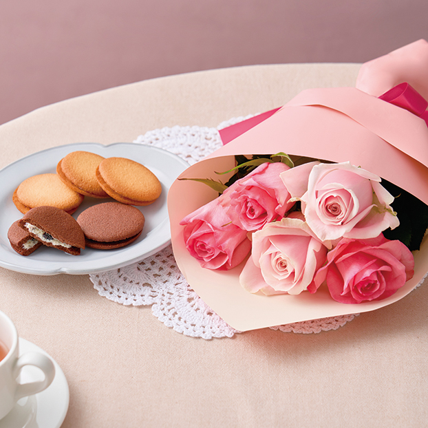 ピンク系のバラを可愛らしいブーケに仕立てました。さっくり食感のクリームサンドクッキー、アンリ・シャルパンティエのラング・ド・シャをセットにしました。