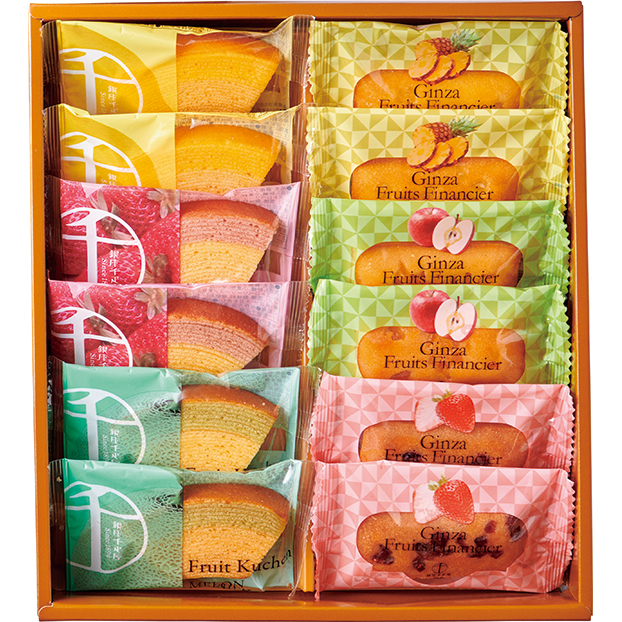 果汁を加えた生地を一層一層丁寧に焼上げたフルーツクーヘンと、フルーツピューレが入った生地を焼上げたフルーツフィナンシェのセット。