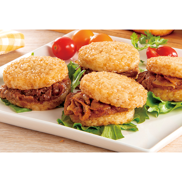 牛カルビと豚生姜。2種類の具を直火釜炊きでふっくら仕上げたご飯でそれぞれサンドしました。